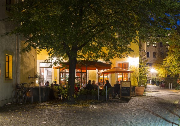 Restaurant Zum Rebstock, in the baroque garden between main alleyway and Raehnitzgasse, alleyway cafe at dusk, Dresden, Saxony, Germany, Europe