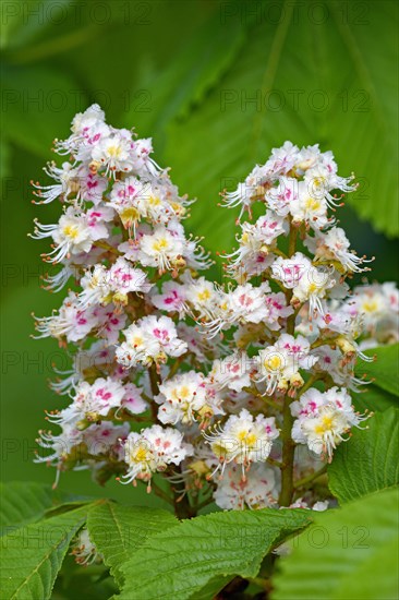Horse chestnut (Aesculus), white inflorescences, spring, North Rhine-Westphalia, Germany, Europe
