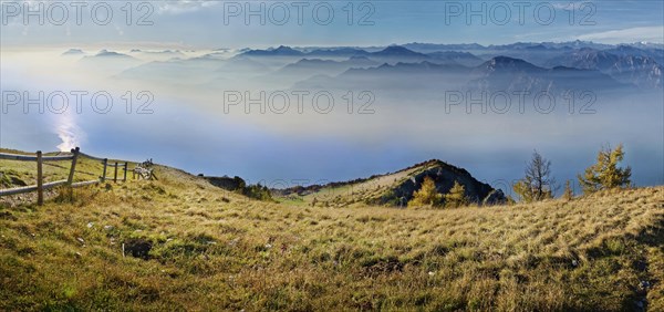 Meadow with fence and Lake Garda in the morning mist with Lake Garda mountains and Bergamo Alps, Monte Baldo, Malcesine, Verona Italy, Trentino-Alto Adige, Italy, Europe