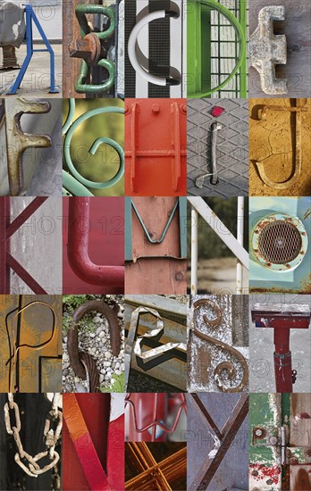 Metal ABC, letters of objects made of metal, portrait format