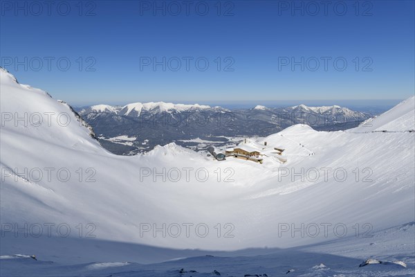 Karwendelgrube Karwendel mountainrange with sun in winter, Mittenwald, Upper Bavaria, Bavaria, Germany, European Alps, Europe