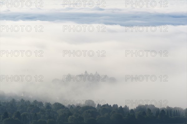 View from Katzenbuckel mountain with morning mist, Waldbrunn, Baden-Wurttemberg, Germany, Europe