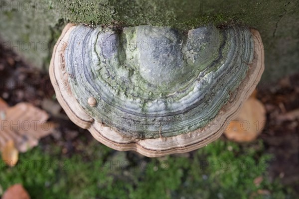 Tinder fungus (Fomes fomentarius), fruiting body on tree from above, North Rhine-Westphalia, Germany, Europe