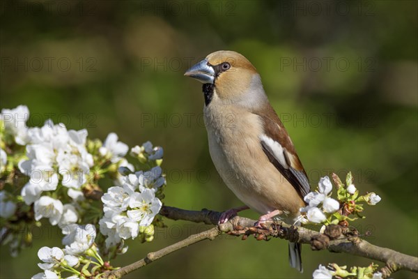 Kernbeisser (Coccothraustes coccothraustes) Weibchen auf bluehendem Kirschzweig, Baden-Wuerttemberg, Deutschland