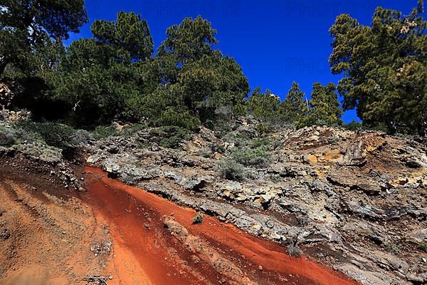 Landscape at the pass road to Roque de los Moschaschos, km 24, Caldera, at Pico de la Nieve, National Park, La Palma, Canary Island, Spain, Europe