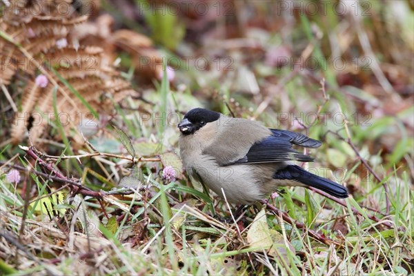Azores Bullfinch (Pyrrhula murina) adult, feeding in vegetation, Sao Miguel Island, Azores