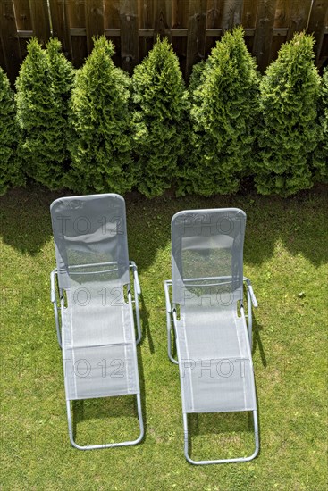 Two garden loungers in a meadow, arborvitaes (Thuja) or Thujen, hedge, wooden fence, privacy screen, front garden, Germany, Europe