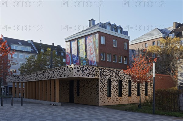 Modern cycle station of the Duesseldorf University of Applied Sciences, HSD, facade made of wood, renewable raw material, Campus Derendorf, Duesseldorf, North Rhine-Westphalia, Germany, Europe