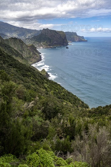 View of steep rocky coast and sea, Porto da Cruz village in the back and Penha de Aguia eagle rock, coastal landscape, Vereda do Larano hiking trail, Madeira, Portugal, Europe