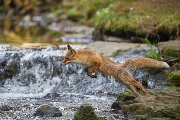 Red fox (Vulpes vulpes), jumping over stream in forest