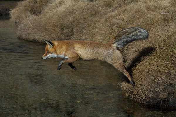 Red fox (Vulpes vulpes) jumping over river, Gran Paradiso National Park, Italy, Europe