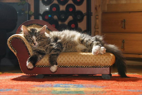 Norwegian Forest felidae (Felis catus) lying on the sofa