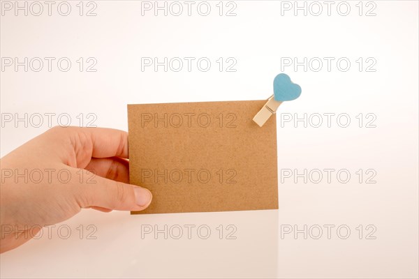 Hand holding a paper placed in a clothespin withe heart on a white background