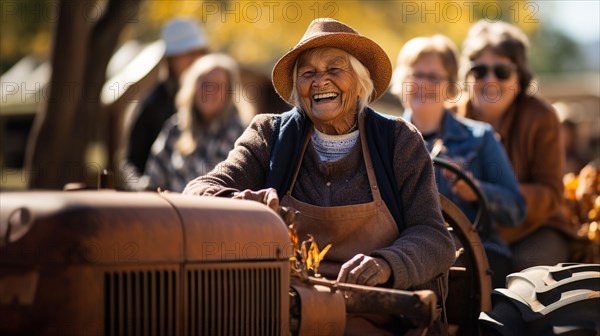 Happy female farmer giving a few guests a tractor ride one fall day, generative AI