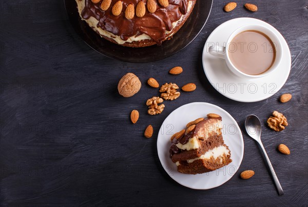 Homemade chocolate cake with milk cream, caramel and almonds on black wooden background. cup of coffee, top view, flat lay, copy space