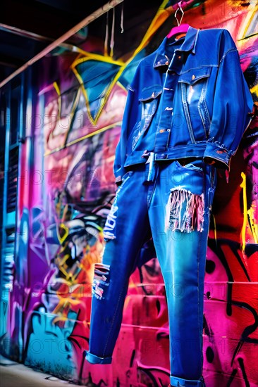 90s fashion collection including overall neon windbreakers tie dye shirts arrayed against a vibrant grafiti wall, AI generated