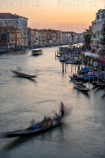 Long exposure, view over the Grand Canal with gondolier at sunset, from the Rialto Bridge, Venice, Veneto, Italy, Europe