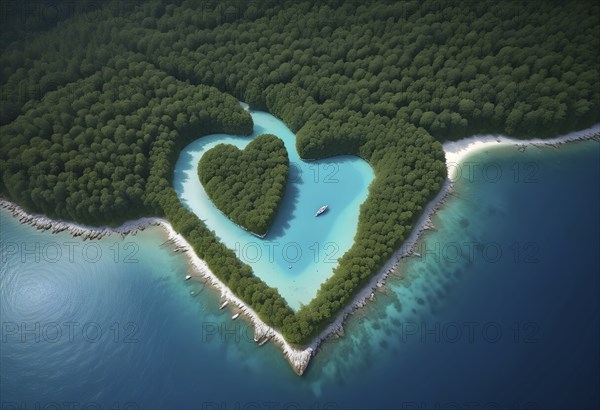 Aerial view of a heart-shaped island surrounded by clear blue water and lush greenery, AI generated
