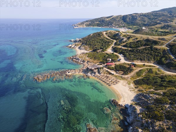 Aerial view, Tigania, Belka and Kriaritsi Beach, Kriaritsi, Sithonia, Chalkidiki, Central Macedonia, Greece, Europe