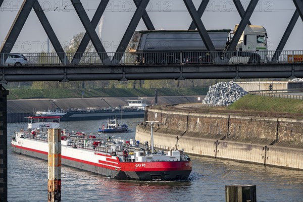 Ruhrorter Straße bridge over the harbour canal, Duisburg-Ruhrort inland port, tanker, Duisburg, North Rhine-Westphalia, Germany, Europe