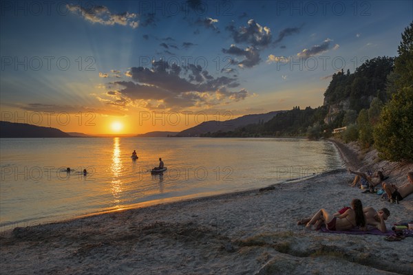 Bathing area and beach, sunset, near Überlingen, Lake Constance, Baden-Württemberg, Germany, Europe