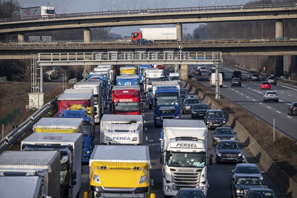 Traffic jam on the A3 motorway, at the Köln-Ost junction, heading south, four lanes jammed with cars and many trucks, over 8 kilometres in total, Cologne, North Rhine-Westphalia, Germany, Europe