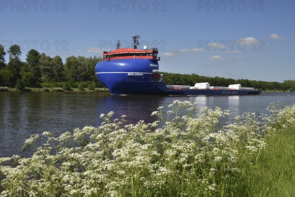Cargo ship Boldwind with wind turbines in summer in the Kiel Canal, Schleswig-Holstein, Germany, Europe