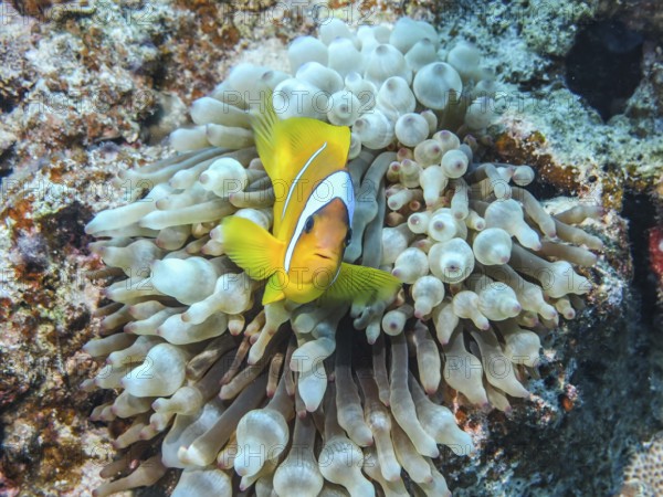 Bubble-tip anemone (Entacmaea quadricolor), red sea clownfish (Amphiprion bicinctus), dive site Siyul Kebir Reef, Red Sea, Egypt, Africa