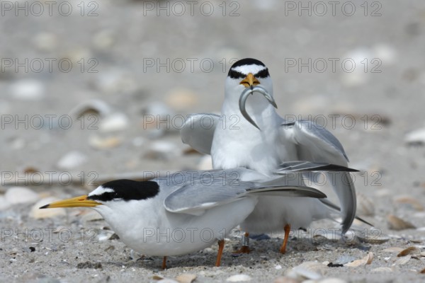 Little Tern (Sternula albifrons), pair during mating ritual, adult birds in courtship display, pair just in front of copulation, cock with fish in beak, mating feeding, Lower Saxon Wadden Sea National Park, East Frisian Islands, Lower Saxony, Germany, Europe