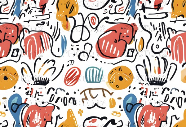 Playful, abstract illustration features a seamless pattern of whimsical hand-drawn shapes and icons in vibrant colorful hues, perfect for creative backgrounds, AI generated