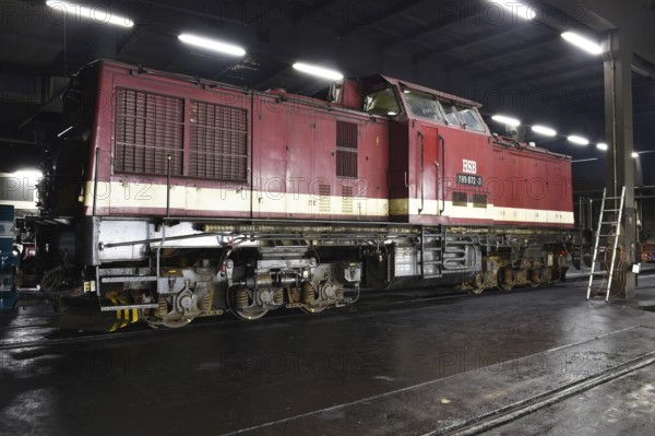 Diesel locomotive of the Harz narrow gauge railway in the engine shed, Wernigerode, Saxony-Anhalt, Germany, Europe