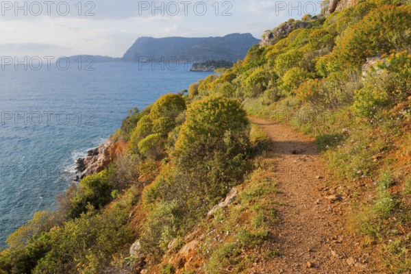 Nature trail along a rocky coast with lush vegetation and views of the open sea, Agia Kyriaki, Nafplio, Nauplia, Nauplion, Nafplion, Argolis, Argolic Gulf, Peloponnese, Greece, Europe