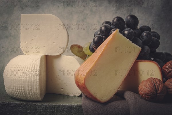 Georgian cheese, Imeretian and smoked suluguni, grapes, nuts, on a cutting board, Georgian cuisine, no people