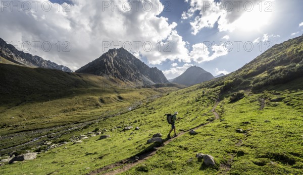 Mountaineers on a hiking trail, green high valley with mountain stream, Keldike Valley on the way to the Ala Kul Pass, Tien Shan Mountains, Kyrgyzstan, Asia