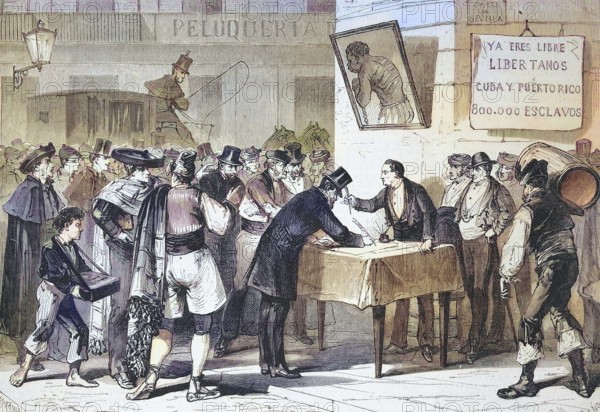 Public subscription in Madrid for the repurchase to free slaves from Cuba and Puerto Rico, 1869, Spain, Historic, digitally restored reproduction of an original 19th century master, exact original date unknown, Europe