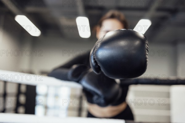 Strong latin boxing woman on the ring at fitness gym. Athletic girl training Muay Thai boxing for bodybuilding and healthy lifestyle concept. Workout in sport club