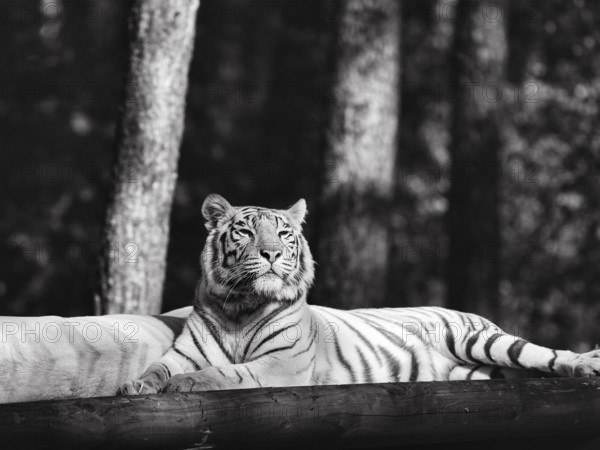 White tiger (Panthera tigris), alert, black and white photo, captive, Safaripark, Safariland Stukenbrock, Schloss Holte-Stukenbrock, North Rhine-Westphalia, Germany, Europe