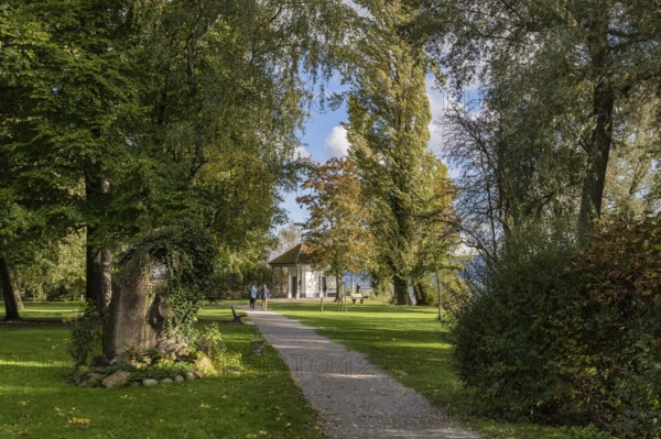 Footpath through Mettnaupark with memorial stone by the poet Joseph Victor von Scheffel and the Urkundenhäuschen, Radolfzell am Lake Constance, Konstanz district, Baden-Württemberg, Germany, Europe