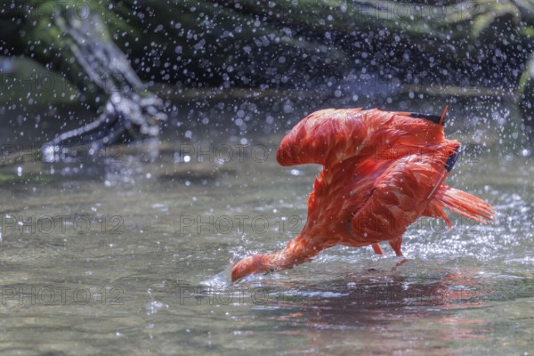 A scarlet ibis (Eudocimus ruber) stands bathing in the shallow water of a riverbank. Water splashes in the beautiful backlight