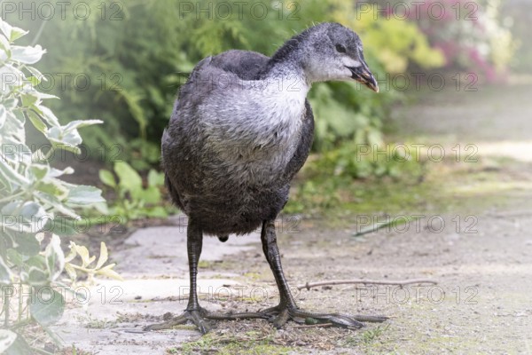 Eurasian Coot chicks (Fulica atra) standing on a path, profile view, close-up, on the left at the edge of the path various plants, marginal vegetation, looking to the right, Dortmund, North Rhine-Westphalia, Germany, Europe