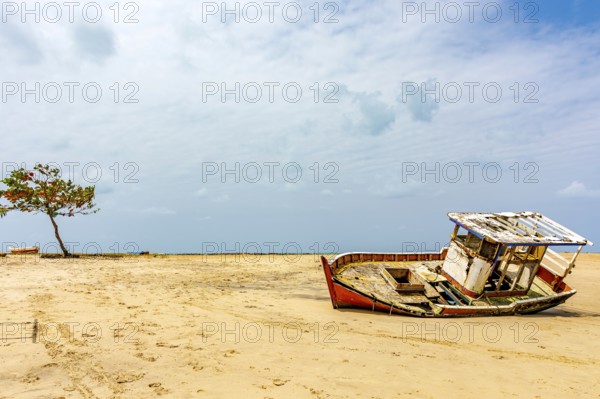 Deteriorated fishing trawler stranded on the beach sand in Olinda, Pernambuco, Olinda, Pernambuco, Brazil, South America