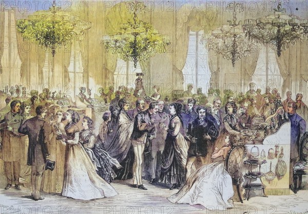 Charity event and sale at the Ministry of Foreign Affairs for the construction of a German hospital in Paris, 1869, France, Historic, digitally restored reproduction of an original 19th century master, exact original date not known, Europe