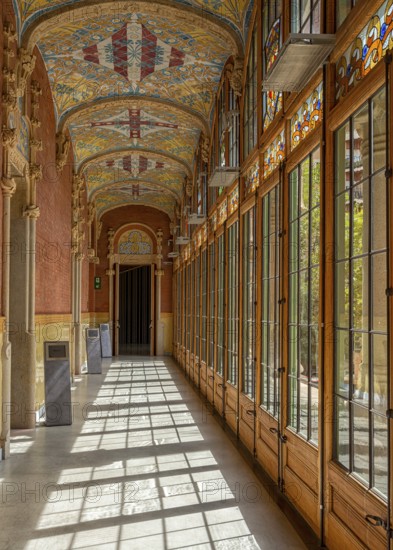 Interior view of the hall and corridors in the main building in the Hospital de la Santa Creu i Sant Pau by architect Lluís Domènech i Montaner, Barcelona, Catalonia