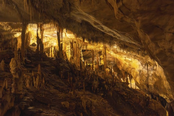 Warm colored lights illuminating majestic stalactites and stalagmites inside the caves of drach in mallorca, spain