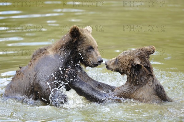 Two young bears playing in splashing water, Eurasian brown bear (Ursus arctos arctos), Bavarian Forest National Park
