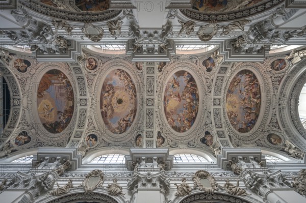 Baroque stucco and ceiling fresco created in the 17th century, Passau Cathedral, Passau, Lower Bavaria, Bavaria, Germany, Europe