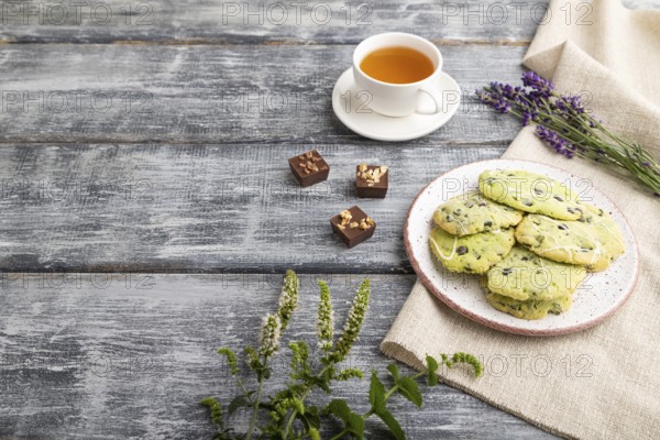 Green cookies with chocolate and mint on ceramic plate with cup of green tea and linen textile on gray wooden background. side view, copy space