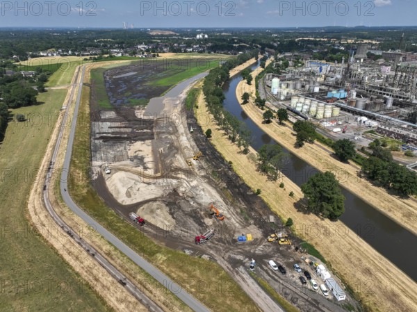 Oberhausen, North Rhine-Westphalia, Germany, renaturalisation of the Emscher in the Holtener Bruch. OQ Chemicals plant Ruhrchemie on the right. The currently straightened Emscher, shown here at flood level, has been given curves again and can meander through its new floodplain. The ecological conversion of the Emscher system consists of the construction of a centralised wastewater treatment system in the Ruhr region, the construction of sewers and the renaturation of the Emscher and its tributaries. Following the construction of a parallel sewer, the Emscher has been completely free of sewage since January 2022. The river was previously an open, above-ground combined sewer with rainwater and wastewater, Europe