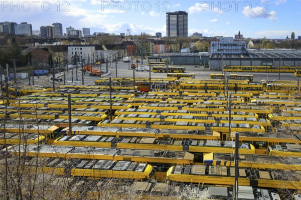 Essen, North Rhine-Westphalia, Germany, Trams at the Ruhrbahn depot, Verdi and EVG warning strike, Essen town hall in the background, Europe
