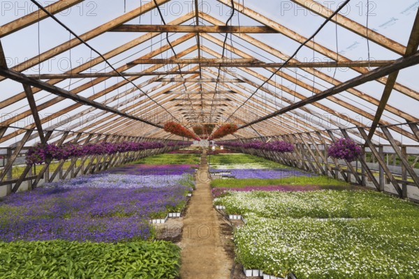 Purple and red Petunias in hanging baskets plus mixed white, lavender and blue flowering plants in containers inside greenhouse in spring, Quebec, Canada, North America